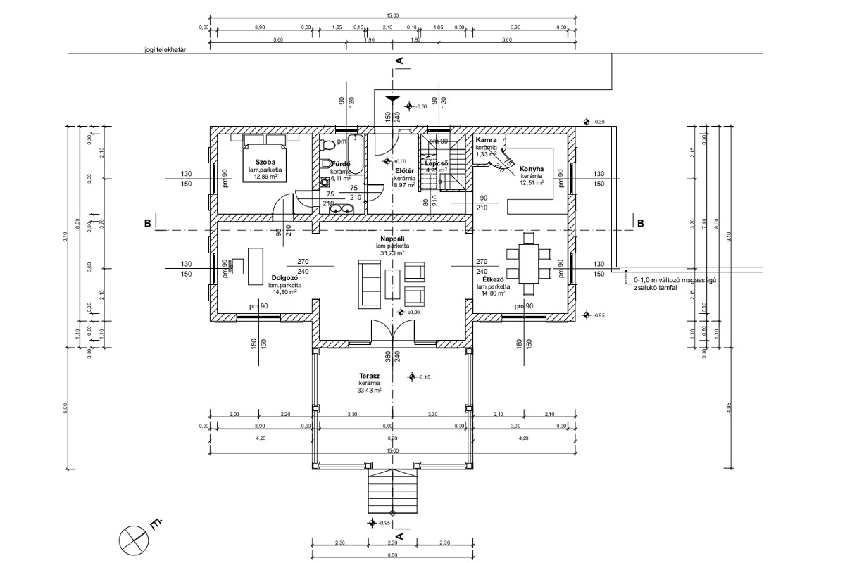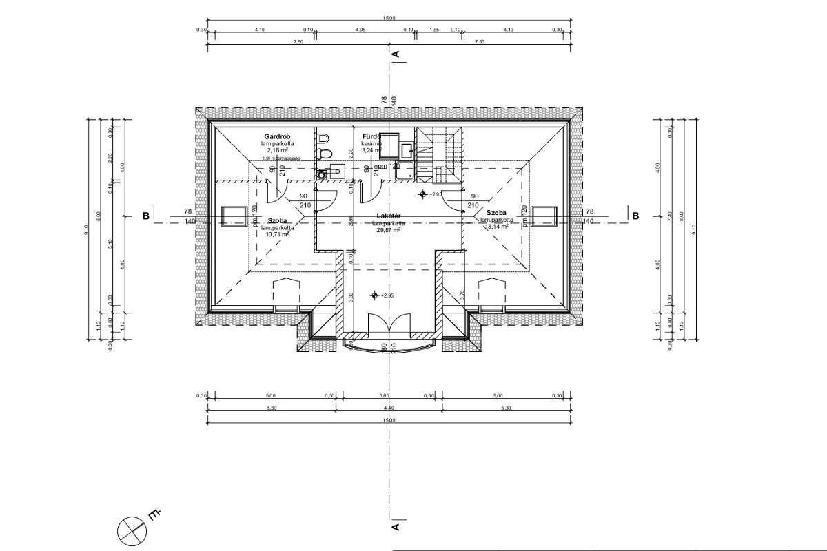 A ház központi helyén elhelyezett kémény kandalló beépítését is lehetővé teszi.