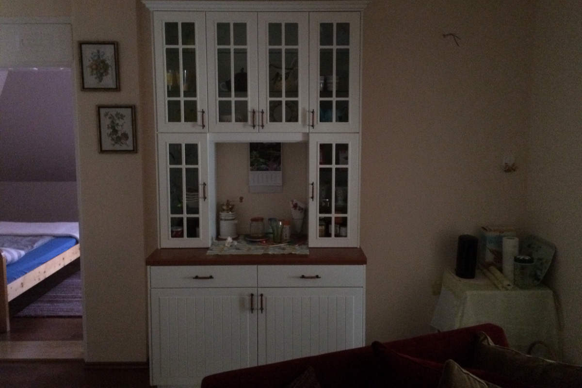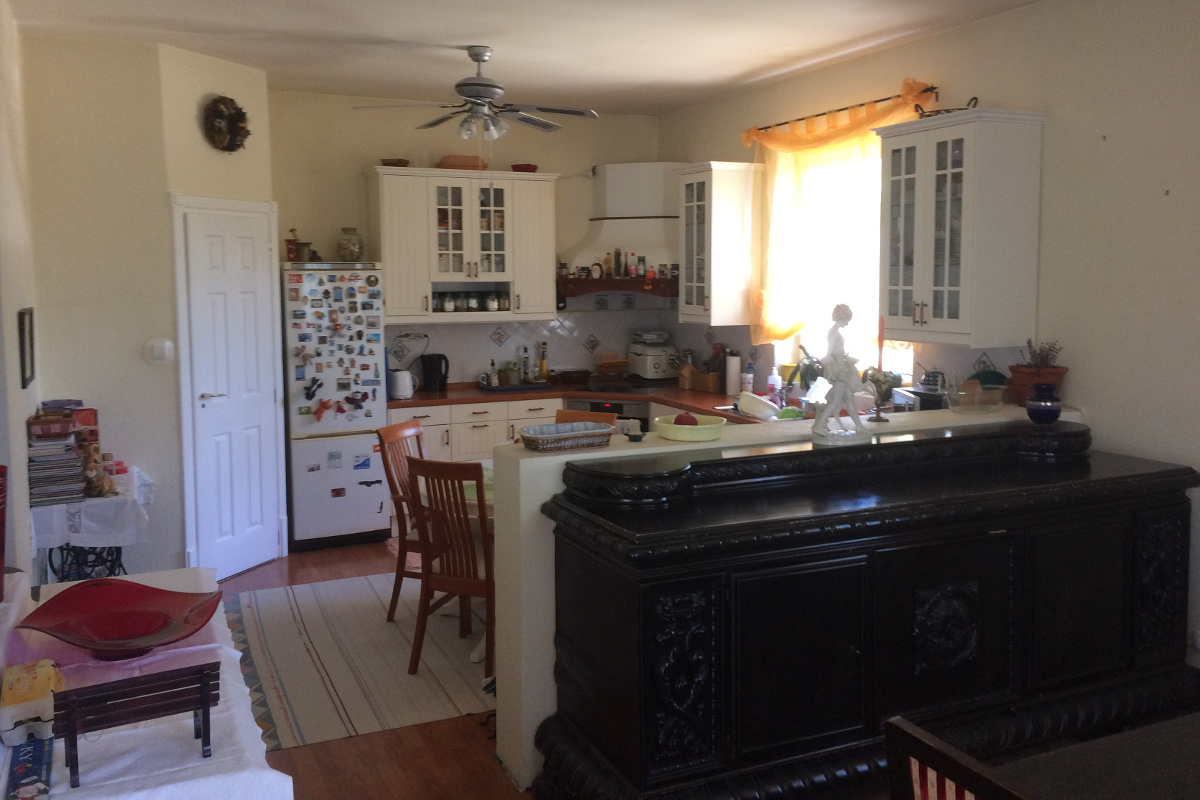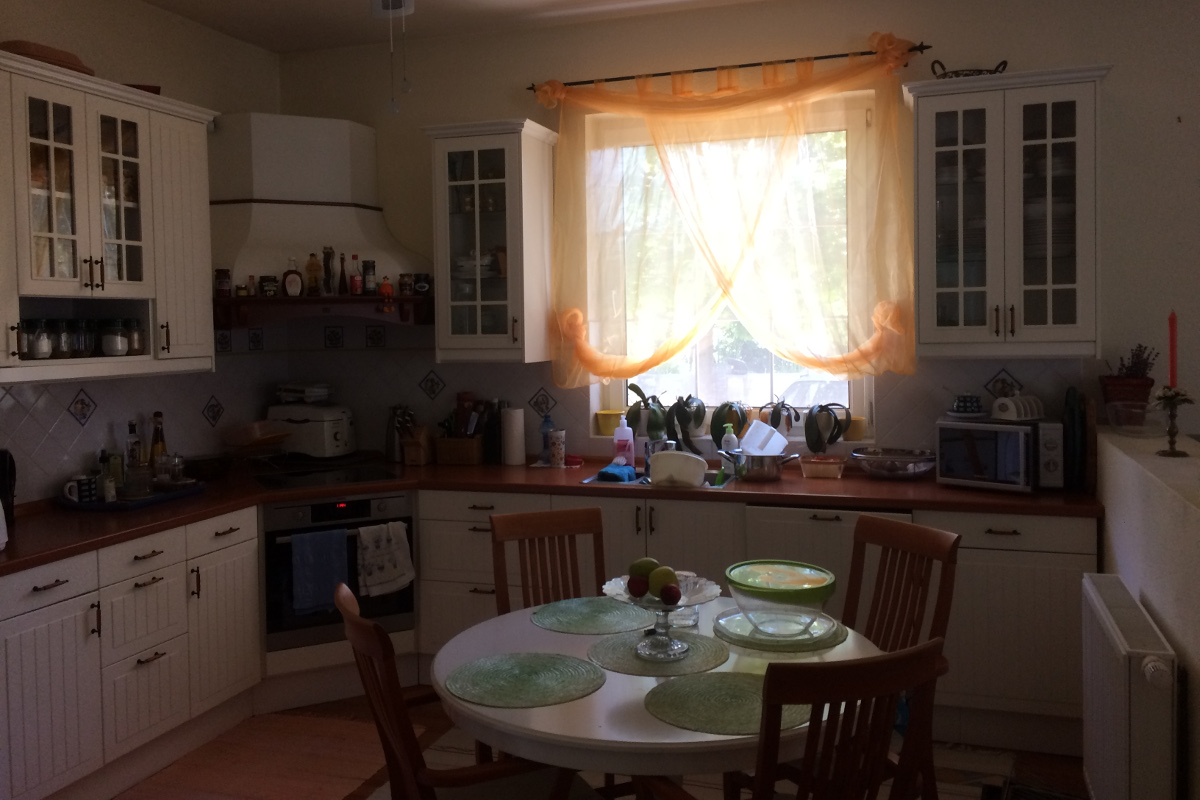 A konyha „L” alakban Ikea konyhabútorral és AEG beépített elektromos főzőlappal és sütővel szerelt. A páraelszívásról egy nagy teljesítményű kürtős páraelszívó gondoskodik. A mosogató tálca egy mély és egy fél mély mosogatóból áll. A konyha még egy tizenkét terítékes Bosch beépített mosogatógéppel rendelkezik. A hűtő-fagyasztó szekrény nem beépített.