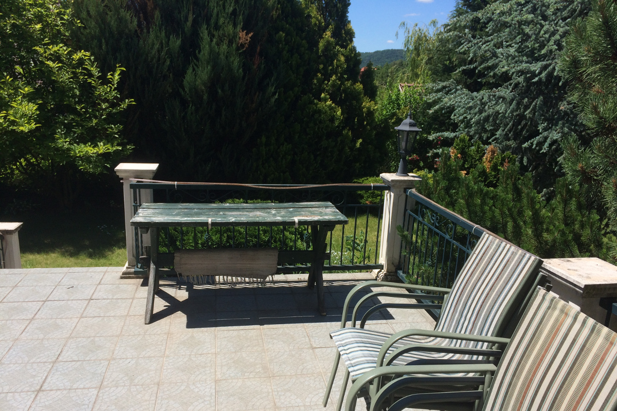 A földszinten találhatunk egy vasalt aljazatbetonból készült 46 m2-es kültéri járólappal burkolt, kovácsoltvas korláttal körbevett külső erkély.