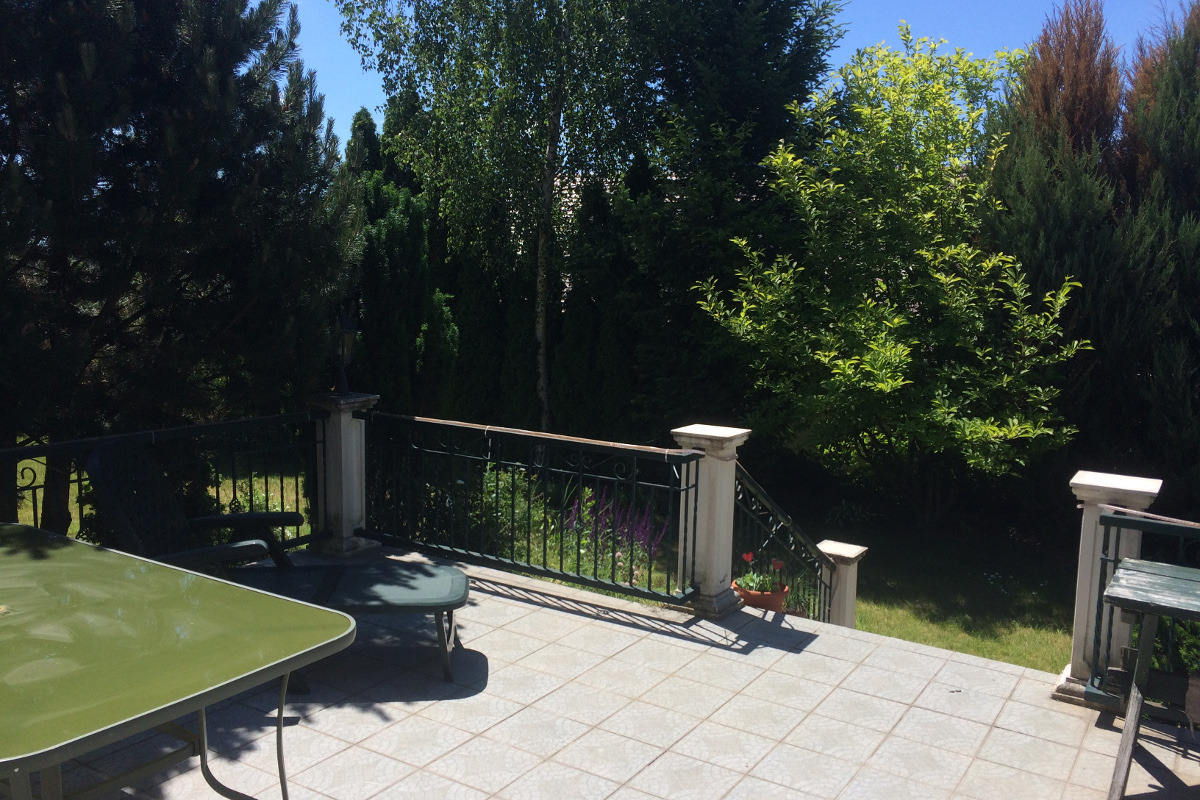 A nappali és a kert szerves kapcsolatát egy nagyméretű terasz biztosítja.